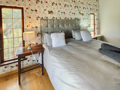 Das Hauptschlafzimmer befindet sich im Erdgeschoss und ist mit einem Queensize-Bett ausgestattet. Es verfügt außerdem über einen eigenen Wohnbereich mit einem gemütlichen Kamin, einem begehbaren Ankleidezimmer und einem eigenen Badezimmer mit Eckbadewanne, Dusche, Toilette, Waschbecken und Bidet.