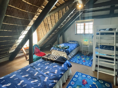 Das sechste Schlafzimmer ist speziell für Kinder konzipiert und verfügt über zwei Einzelbetten sowie ein Etagenbett. Dieses Zimmer liegt getrennt vom Haupthaus und bietet einen privaten Raum, der für einen Teenager geeignet ist, der Unabhängigkeit sucht, oder für einen älteren Gast, der einen ruhigen Rückzugsort abseits der Treppen sucht. Es verfügt auch über ein eigenes Badezimmer mit Dusche, Toilette und Waschbecken.