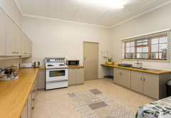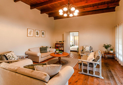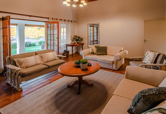 Kammanassie Farmstay has three spacious en-suite bedrooms. Each of the rooms has its own private entrance with spectacular views of the rolling hills. The main bedroom is furnished with a Queen-size bed and opens onto the back veranda. The room has an en-suite bathroom fitted with a bath and shower. The second bedroom is furnished with twin beds, while the third bedroom contains a double bed and a bunk bed. Each of these rooms has an en-suite bathroom fitted with a shower, and all three bedrooms are decorated with antiques to create a warm and comfortable atmosphere. Heaters and fans are also provided for extra comfort. The fully equipped kitchen contains a fridge, stove and oven, microwave, toaster, as well as tea and coffee facilities, and meals can be enjoyed at the 8-seater dining table. The living room has comfortable chairs and a heater, opening onto the front covered patio which offers outdoor dining as well as braai facilities, enjoying views of the farm. A splash pool is available for the hot days. Kammanassie Farmstay has good cellphone reception and free Wi-Fi but does not have a television.