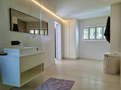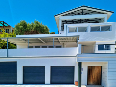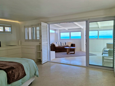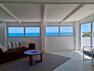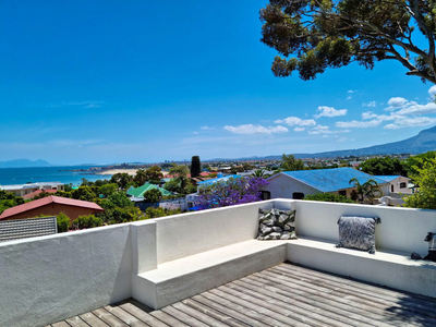 A cosy couch in the living area provides the perfect spot to relax with a morning coffee, or guests can step out onto the private deck to enjoy sweeping views across Gordon’s Bay’s charming old village, stretching across the bay to the distant outline of Table Mountain.