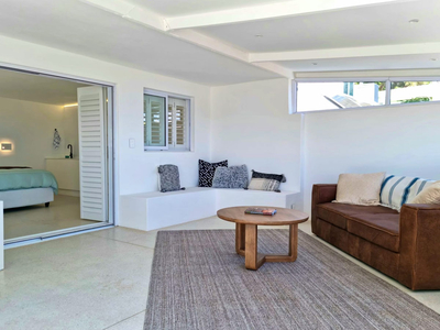 Das gemütliche Sofa im Wohnbereich lädt zum Entspannen bei einem Morgenkaffee ein. Alternativ können Sie auf der privaten Terrasse den atemberaubenden Blick über das charmante alte Dorf Gordon's Bay genießen, das sich über die Bucht bis hin zum Tafelberg in der Ferne erstreckt.