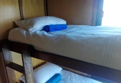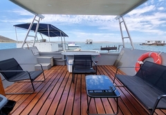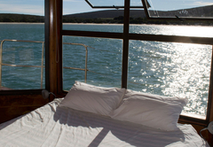 This large boat has an upper and lower deck. The lower deck is luxuriously furnished with a spacious lounge and fireplace, a modern fully equipped kitchen, five spacious bedrooms with Queen-size beds (or singles if preferred) and a sixth room with two bunk beds. There are three bathrooms. There is a large deck area off the lounge with outside seating. This level has three full bathrooms with toilets, large pentagonal showers and basins. The upper deck has a spacious lounge area, two bedrooms with Queen-size beds and a third room with a double bed. There is also two comfortable sleeper couches in the lounge and a full bathroom. There is a deck area for lounging and sunbathing. This level has one full bathroom with a toilet, large pentagonal shower and basin.