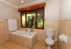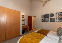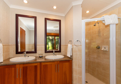 Das Hauptschlafzimmer ist mit einem Kingsize-Bett und das zweite Schlafzimmer mit einem Queensize-Bett ausgestattet. Diese beiden Zimmer verfügen jeweils über ein eigenes Badezimmer mit Dusche, Badewanne, Toilette und Waschbecken. Es gibt zwei zusätzliche Schlafzimmer, die jeweils mit zwei Einzelbetten ausgestattet sind. Diese Zimmer teilen sich ein Badezimmer mit Badewanne, Dusche, WC und Waschbecken. Bettwäsche und Badetücher werden gestellt. Gäste müssen ihre eigenen Badehandtücher mitbringen.