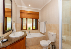 Kruger Park Lodge 308 is a self-catering holiday home in Hazyview with four bedrooms. The main bedroom is furnished with a King-size bed and the second bedroom is furnished with a Queen-size bed. These two rooms each have an en-suite bathroom fitted with a shower, bath, toilet and basin. There are an additional two bedrooms each furnished with twin beds. These rooms share a bathroom fitted with a bath, shower, toilet and basin. Linen and bath towels are provided. Guests need to bring their own swimming towels. The air-conditioned living area features an open-plan design with a kitchen fully equipped with a stove, oven, microwave, fridge-freezer, cutlery and crockery as well as a breakfast bar with stools. For convenience, a dishwasher, washing machine and tumble dryer are also available. Adjacent to the kitchen is a dining area with ample seating for guests to enjoy their meals together. Leading from the dining area is a lounge with comfy seating, a fireplace and a TV with satellite channels. Complimentary Wi-Fi is available. Through the sliding doors, there is a spacious covered patio with outdoor furniture and a built-in braai. This patio overlooks the swimming pool.