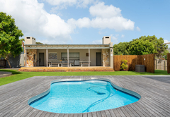 The spacious bedroom is furnished with a queen-size bed and has an en-suite bathroom fitted with a bath, shower, toilet and basin. The kitchen is fully equipped for your self catering stay. The living areas are equipped with a luxury Italian leather couch, TV with DStv, Wi-fi and a dining table. A sliding door opens onto a private patio overlooking the swimming pool, undercover braai area and the beautiful one acre garden.