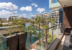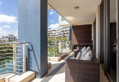Der Komplex verfügt über vier Gemeinschaftspools, einen voll ausgestatteten Fitnessraum, einen 24-Stunden-Zugangskontrolldienst und einen überdachten Parkplatz mit direktem Zugang zum Gebäude.