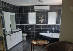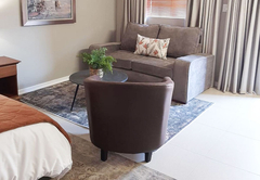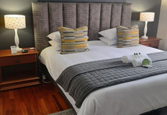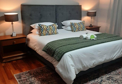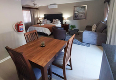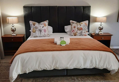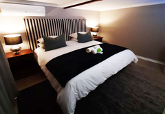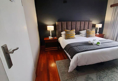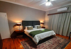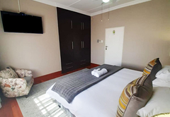 Executive King Room 1 is furnished with a King-size bed. The en-suite bathroom is fitted with a bath, toilet and basin. The room offers air-conditioning, a TV with DStv and Wi-Fi access. Guests have access to a communal kitchen and guest lounge.