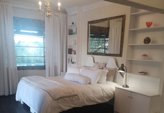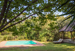 The Farmhouse is a relaxed haven of easy country living with tranquil, uninterrupted views to the horizon over the pond, pool and rolling hills of The Crocodile River Reserve. The Farmhouse is on its own private property adjoining Lethabo Estate. Lethabo Farmhouse has four bedrooms. The master bedroom has a King-size bed and en-suite bathroom with dual vanity, bath and shower. The second bedroom has a King-size bed and the third and fourth bedrooms have double beds. These rooms are all en-suite with a shower. French doors lead onto a private veranda and view of pond and reserve. The large farmstyle kitchen is fully equipped and has a dining area. The lounge has a fireplace and comfy furniture. All the rooms lead out onto a colonial style veranda, which runs around the entire exterior, surrounding the house and looking out over the shady garden and pool. The interiors are light, spacious and furnished with comfortable, contemporary elegance. Securely enclosed, it boasts shady, mature trees in an established garden for lazy afternoons relaxing next to your private swimming pool. The generous braai and lapa areas and wide stoeps, make it a perfect digital detox, defrag for a couple or a large social group.