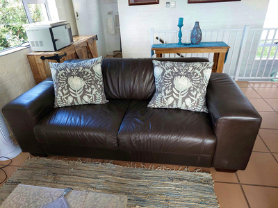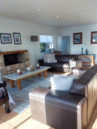 The open-plan living area includes a fully equipped kitchen with a gas stove, electric oven, microwave, fridge-freezer, dishwasher, and all necessary cutlery and crockery, complemented by a breakfast bar with stools. Adjacent to the kitchen is a six-seater dining table, perfect for shared meals. The lounge area offers comfortable leather couches, a fireplace, and a television with DStv, while guests can also enjoy complimentary Wi-Fi throughout the property.