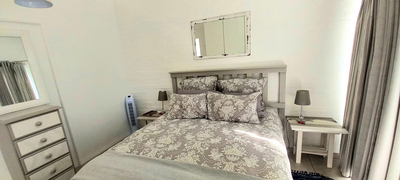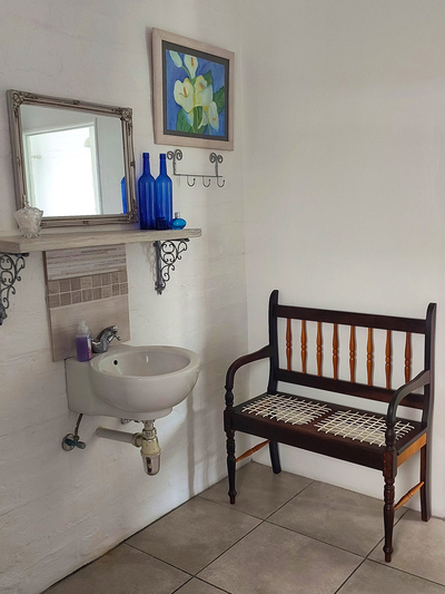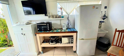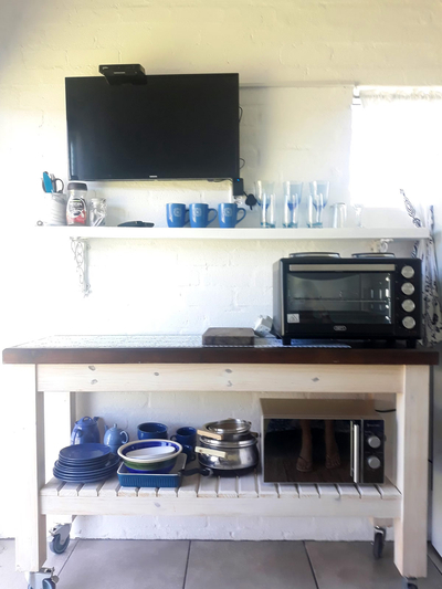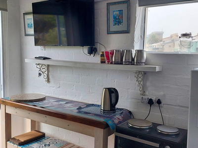 A compact kitchenette is available for preparing meals and includes a 2-plate stove, mini-oven, air fryer, toaster, microwave, fridge-freezer, and all necessary cutlery and crockery, as well as tea- and coffee-making facilities. The space also provides a seating area, a TV with DStv, and a table for two, making it ideal for relaxed dining or casual entertainment. Guests have access to free Wi-Fi throughout the unit.