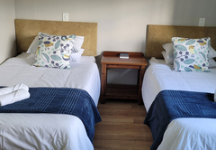 Das Hauptschlafzimmer ist mit einem Queensize-Bett ausgestattet und verfügt über ein eigenes Bad mit Dusche. Das zweite Schlafzimmer hat auch ein Queen-Size-Bett und das dritte Schlafzimmer hat zwei Einzelbetten. Diese beiden Zimmer haben beide ein komplettes Badezimmer.