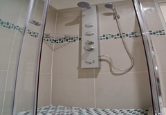 Das moderne und stilvolle Badezimmer verfügt über eine verglaste Dusche mit Duschsäule. Seife, Shampoo und Duschgel wird zur Verfügung gestellt.