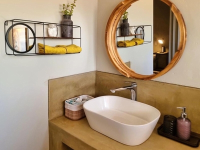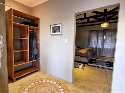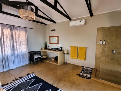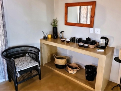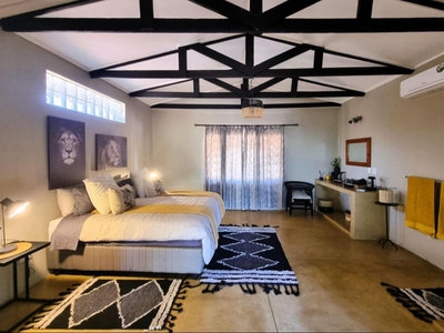 Lions Cottage is a newly refurbished, modern room featuring a king-size bed with a set of four pillows and an en-suite bathroom with an open-plan shower. The room offers a peaceful view of the bush garden through its window and includes a charming sitting patio for outdoor relaxation. Amenities include Wi-Fi, air conditioning, a sitting area, a desk, and regular cleaning service. Guests will also find convenient features such as converters/voltage adaptors, non-feather pillows, and bathroom essentials including a hairdryer, bathrobe, and shower amenities. Additional comforts include coffee and tea facilities, and the room is non-smoking throughout.