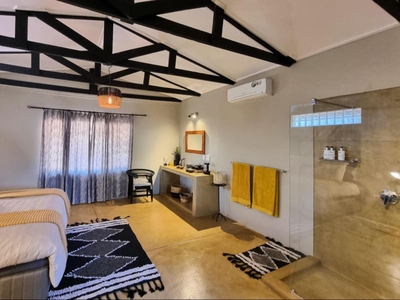 Elephants King Room is furnished with a King-size bed. The en-suite bathroom is fitted with a large bath / shower, toilet and dual vanities. A large window overlooks the bush. The room has Wi-Fi, a sitting area, desk, fan, and air conditioning. In every room, you will find complimentary mineral water, chocolate, toiletries, hairdryer and plug adapters.