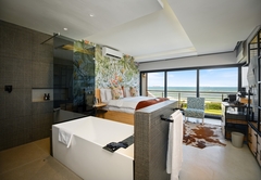 Whale Shark a King-size bed. The open plan bathroom is fitted with a shower, bath, toilet and basin. Rooms include complimentary tea, coffee and mineral water. Also included are fresh fruit, flowers, air-conditioning, smart TV with Netflix, bathrobes, slippers, Wi-Fi, mini-bar, personal safe, hairdryer and patio.
