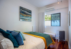 Clifton Beachfront Magic Apartment verfügt über drei Schlafzimmer. Das Hauptschlafzimmer verfügt über ein Kingsize-Bett und ein eigenes Bad mit einer Dusche über der Badewanne. Das zweite Schlafzimmer hat ein Kingsize-Bett und das dritte Schlafzimmer hat ein Queensize-Bett. Das Hauptbad hat eine Dusche.