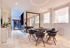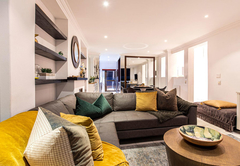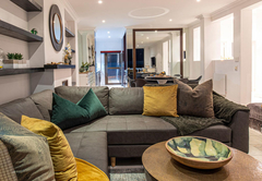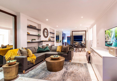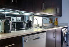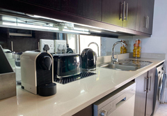 Das klimatisierte Apartment verfügt über einen typischen offenen Küchen- / Ess- / Wohnbereich mit allen notwendigen Annehmlichkeiten, einschließlich, aber nicht beschränkt auf eine Nespresso-Kaffeemaschine, einen Flachbildfernseher und eine Soundbar, einen Marshall-Lautsprecher, einen Geschirrspüler, eine Waschmaschine und einen Tumble Trockner.