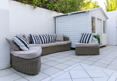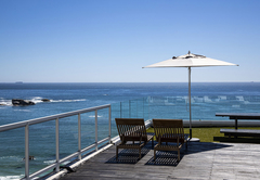 Genießen Sie den uneingeschränkten Blick auf das Meer von jedem Punkt im Haus oder von der geschwungenen Terrasse, von der aus Sie den Blick auf das Meer bis in die beeindruckende Bergkette der Zwölf Apostel haben. Die Terrasse verfügt über komfortable Gartenmöbel.