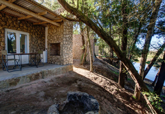 A Stone cottage on the rivers edge with a King-size bed and an en-suite bathroom . There is a fireplace and undercover braai area as well as Communal kitchen facilities and a Communal Hot Tub area.