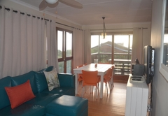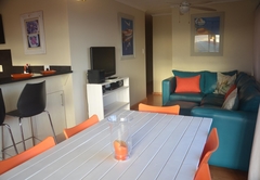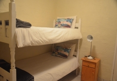 The apartment has three bedrooms; one en-suite and furnished with a Queen bed, one with a double bed and the third with a bunk bed. The second and third rooms share a bathroom. There is an open plan kitchen and living area which boasts sea and mountain views. The kitchen is fully equipped for self catering. Other facilities include DStv (selected channels), a Weber and an iPod docking station.