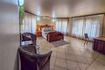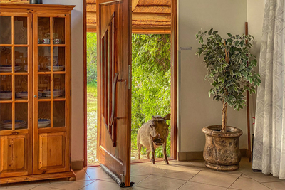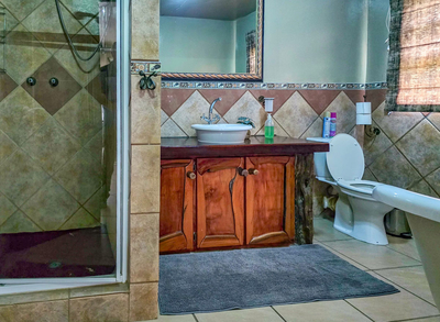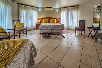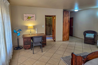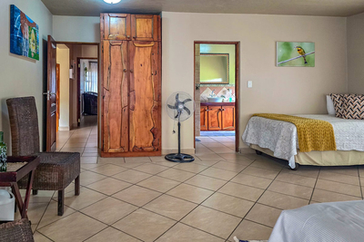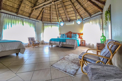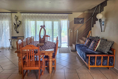 Paradise Lodge holiday home sleeps 10 guests in five bedrooms, each with air conditioning and its own bathroom. The first room has a Queen-size bed and a full en-suite, the second room has two three-quarter beds for children and a full en-suite. The third and fourth room each have two three-quarter beds and a bathroom with a shower. The fifth room, or the honeymoon suite has a Queen-size bed and a bathroom with a walk in shower. This room has access to the balcony with spectacular views. There is an open plan kitchen that is fully equipped with everything you will need, a dining room and a comfortable lounge area with a flat screen TV and DStv.