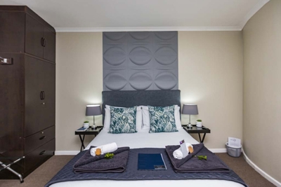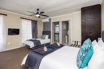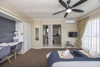 This is a Standard Room furnished with a double bed and one single bed. The en-suite bathroom is equipped with a shower, hand basin and WC. Other facilities nclude air-conditioning, free Wi-Fi, TV. With kitchenette and mini bar fridge, coffee and tea station, microwave, cooking utensils and crockery. Stunning view of Table Mountain.