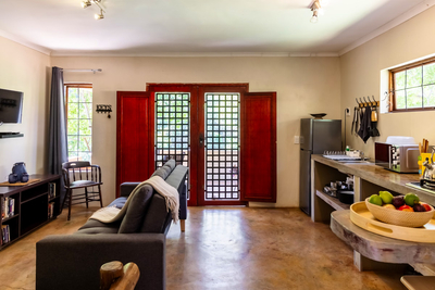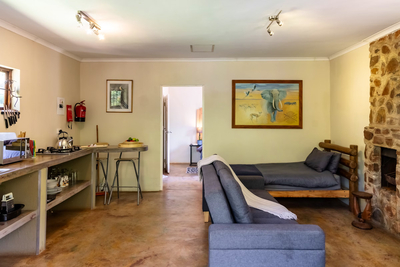 Rocky Drift Reed Cottage is a fully furnished open plan cottage sleeping three adults. The bedroom has a King-size bed. There is one bathroom with a shower only. There is a well-equipped kitchen with a fridge, microwave and gas hob. The lounge area has a single bed and a flat screen TV with open view channels and a fireplace. The private patio overlooks the river and has a table and chairs should you like to dine al fresco.