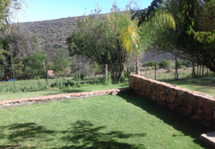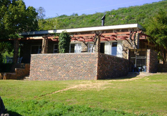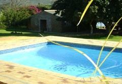 The 5-sleeper cottage can accommodate up to a maximum of 3 adults and 2 children under 12-years old. Two bedroom self-catering units. One room with double bed and one room with twins and there is a sleeper couch for two in the lounge. The kitchen is fully equipped and the patio has a braai area. We provide bedding but not towels. This unit has a inside fire place. All of the cottages have outside braai's and indoor fireplaces. The living areas open up onto shaded patios. This 6-sleeper cottage has use of a shared swimming pool.