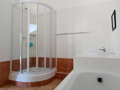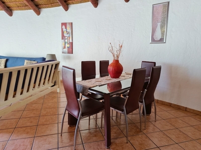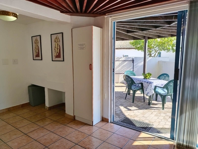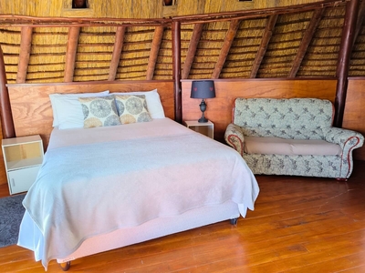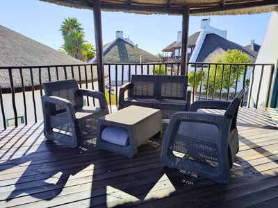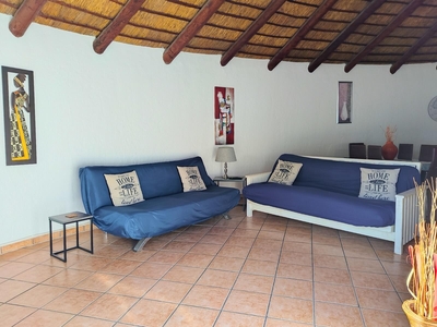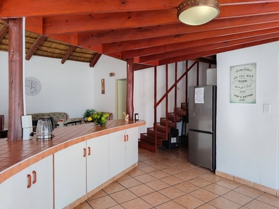 Slakkepas 61 is a thatched-roof house that can accommodate six persons and has two bedrooms, and a loft room with an en-suite bathroom fitted with a bath, shower, toilet and basin. The two downstairs bedrooms are each furnished with a double bed, and there is a double bed in the loft. The separate bathroom is fitted with a bath, shower, toilet and basin. All bedding is provided, guests must bring their own towels. The fully equipped kitchen contains a fridge-freezer, oven, stove, microwave and a washing machine. The open-plan living area has a six-seater dining table, and the lounge features a TV with HD OpenView. There is a covered patio with a built-in braai where guests can enjoy preparing meals together. Guests have access to a communal swimming pool. Towels, black bags, soaps (kitchen and bathroom), extra blankets, wood, food or toiletries are not provided. A maximum of two pets are welcome by prior arrangement.