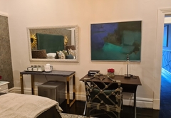 The Chanel Room is furnished with a King-size bed. The en suite bathroom is fitted with a shower, toilet and basin. The room also has linen and towels, a tea / coffee tray, Wi-Fi and a TV with DStv channels. This room has a classic romantic feel with a beautiful chandelier, and stylish decor