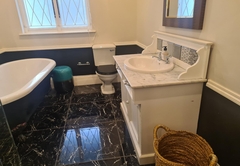 The Black Diamond Suite is furnished with a King-size bed. The en suite bathroom is fitted with a shower, toilet and basin. The room also has linen and towels, a tea / coffee tray, Wi-Fi and a TV with DStv channels. This room has a classic romantic feel with a beautiful chandelier, and stylish decor