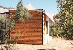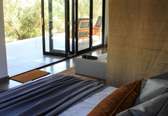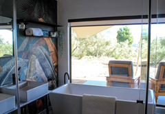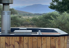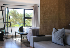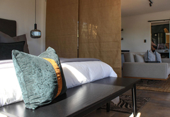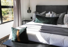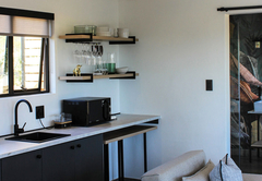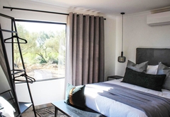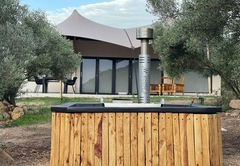 The Olive Lodge is air-conditioned and furnished with a Queen-size bed. The en-suite bathroom is fitted with a shower, bath, toilet and double vanity. The lounge area has a double sleeper couch. The full self-catering kitchenette has all the necessities, including a bar fridge, gas stove and coffee station. Outside is a patio, braai area and a wood-fired hot tub.