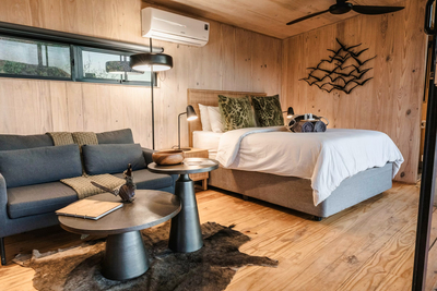 The Pods are cosy and stylish cabins that can accommodate two guests, and feature an open-plan design. They are furnished with a Queen-size bed and feature an en-suite bathroom fitted with a shower, washbasin and toilet. Quality linen and bath towels are provided. Additionally, these solar-powered cabins have a lounge with a fireplace and a kitchenette equipped with a 2-plate gas stove, bar fridge, Nespresso machine, cutlery and crockery. For total relaxation, this cabin has no TV or Wi-Fi.