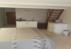 This loft room has a Queen-size bed, a three-quarter bed and an en-suite bathroom with a shower. The unit has a a small kitchenette with a microwave, kettle and a toaster. The venue has safe and secure parking, free Wi-Fi and DStv in all units.