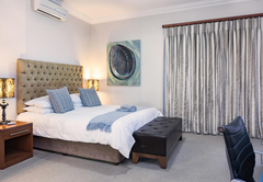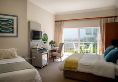 This is a superior en-suite room opening onto an upstairs balcony with stunning views of the Atlantic Ocean and Robben Island. The balconies have privacy partitions. This room has a Queen-size bed. All the rooms have en-suite bathrooms with a shower, air conditioning, TV with satellite channels, Wi-Fi, tea / coffee trays, hairdryer, safe, bar fridge and luxurious bathroom amenities.