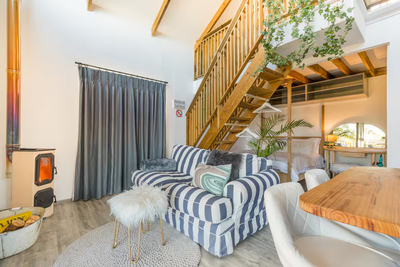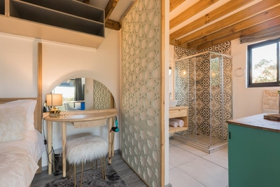 Treedom Villa is styled luxury boho-chic self catering holiday home. Listen to the birds while you cook in the beautiful modern kitchen with its Moroccan tiling, luxury cookware and open wooden shelving. The lounge area is made for relaxation with its comfy couch, fire place, luxury throws and a big screen TV with DSTV, Netflix and Amazon Prime. Enjoy a good book on your private patio as you gently sway on the modern floating daybed and soak up the scenery. End your day dining alfresco at your hand-crafted dining table. Or why not enjoy a braai downstairs in your outdoor forest lounge.