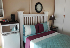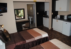 This Standard Room has a bedroom furnished with one double bed. The en-suite bathroom is equipped with a shower. Other facilities include a kitchenette equipped with bar fridge, microwave, crockery and cutlery for self-catering.