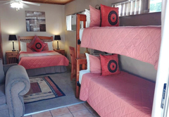 This Basic Family Unit is open floor plan furnished with one double bed and two single beds (bunk beds), sleeping four guests in total. The en-suite bathroom is equipped with a shower. Other facilities include a kitchenette equipped with bar fridge, microwave, crockery and cutlery for self-catering. Bench on patio with braai.