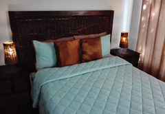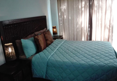 Schlafzimmer mit einem Queen-Size-Bett und einem Einzelbett. En-suite Dusche. Kochnische mit Bar, Kühlschrank, Mikrowelle, Geschirr und Besteck für Selbstversorger.