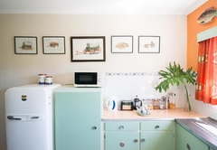 This open plan Classic Studio Apartment has a double bed and an extra single bed so sleeps three adults or a small family comfortably. The super funky retro 1930's and 1950's furniture are all classics and have been lovingly collected over the years. The kitchenette is kitted out for self catering with a medium height fridge freezer, double hot plate, convection microwave and all the paraphernalia required to prepare simple meals. The large kitchen table is perfect for enjoying meals or working with a laptop. The kitchenette is also stocked with coffee, tea and sugar.