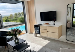 Eine Mikrowelle sowie Tee- und Kaffeezubehör sind vorhanden, und die Zimmer und Suiten öffnen sich auf eine Terrasse mit Sitzgelegenheiten im Freien mit Blick auf die Umgebung und verfügen über private Tauchbecken und Whirlpools.