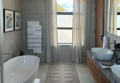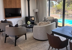 The Presidential Suite is furnished with a King-size bed that can be converted to twin beds and has an en-suite bathroom fitted with a bath, shower, toilet and basin. Bathroom amenities are provided. The beautifully furnished, air conditioned room has a fireplace and opens to a furnished patio with a hot tub and plunge pool. Room facilities include Wi-Fi, DStv, NetFlix, tea / coffee facilities, a hairdryer, safe and minibar.