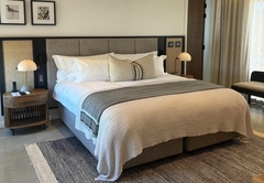 The Deluxe Lodge Room is furnished with a King-size bed that can be converted to twin beds and has an en-suite bathroom fitted with a bath, shower, toilet and basin. Bathroom amenities are provided. The beautifully furnished, air conditioned rooms open to a furnished patio with a hot tub. Room facilities include Wi-Fi, DStv, NetFlix, tea / coffee facilities, a hairdryer, safe and minibar.