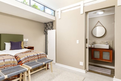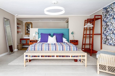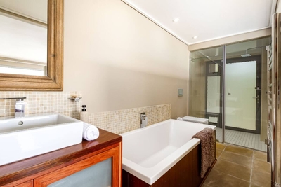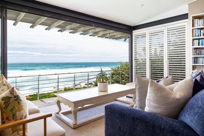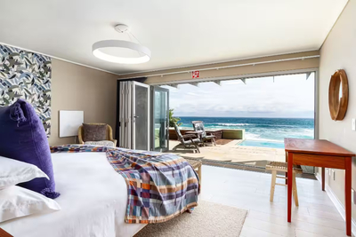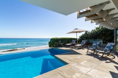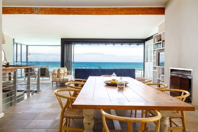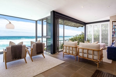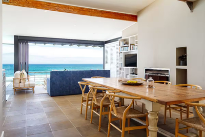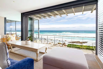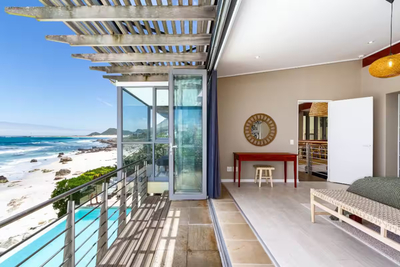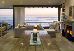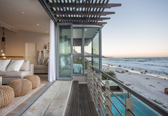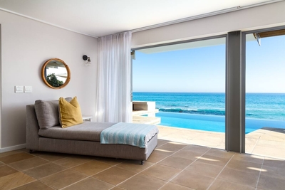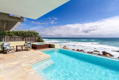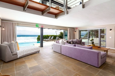 Villa Misty Cliffs is an exquisite three bedroom luxury holiday home in Cape Town situated right on the beach at Misty Cliffs which sleeps a maximum of eight guests (accommodates six adults and two children). It is an ultra-luxurious designer home with spectacular, unobstructed views of the sea. Misty Cliff's living area is open plan with a beautiful lounge, dining area and kitchen (upstairs), which opens onto two terraces. Two of the bedrooms are sea facing with the main bedroom having access onto the balcony on the top floor and the other, downstairs bedroom, opens onto the pool and Jacuzzi area. Both modern bedrooms boast gorgeous views of the ocean. The 3rd bedroom has twin beds with 2 bunk beds for the little ones. All bedrooms have en-suite bathrooms and there is also a fabulous entertainment area with TV and sofas which open onto the pool and Jacuzzi area.