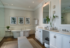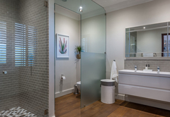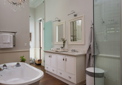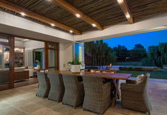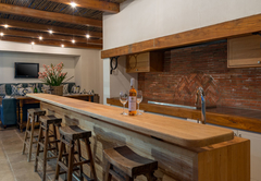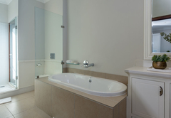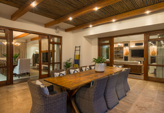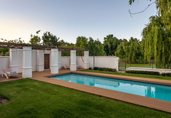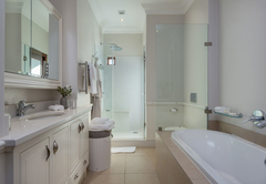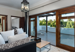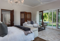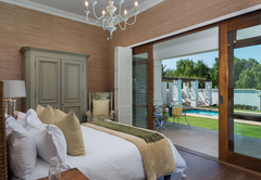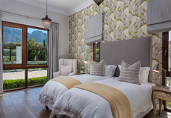 Vrede en Lust The Residence has six en-suite bedrooms. Bedrooms in the villa combine stunning architecture with modern furnishings and amenities. The rooms are air-conditioned with elegant en-suite bathrooms with designer toiletries. Four of the rooms have King-size beds and two rooms have two single beds which can also be converted to King-size beds. All the bathrooms have both a bath and shower except for one which only has a shower. There is also a guest toilet attached to the formal lounge and a shower connected to the treatment room. There are multiple contemporary indoor and outdoor entertainment areas. All the rooms have TV with satellite channels and Netflix, including in the gym and patio lounge. There is complimentary Wi-Fi throughout the whole villa. There is a salt water completely private swimming pool on the property, not heated. There is a garage that leads to the kitchen with space for two cars, but lots of parking for at least ten more cars. The villa is serviced daily.