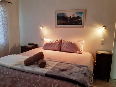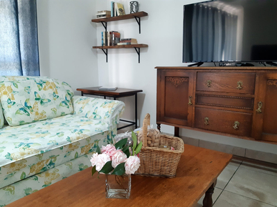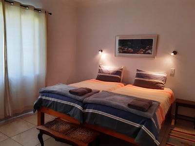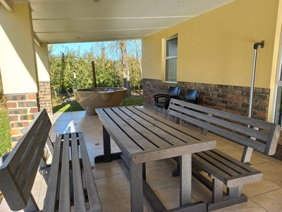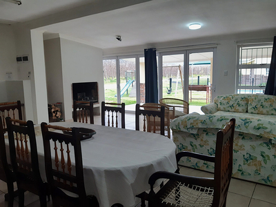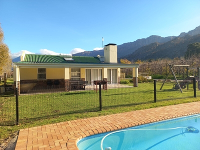 Voelvlei Cottage 5 is a three bedroomed cottage in Prince Alfred Hamlet. One room is furnished with a King-size bed, and there are two rooms furnished with twin beds. There are two bathrooms, one is fitted with a big bath, shower, toilet and basin and the second is furnished with a shower, toilet and basin. There is an open-plan living area with a built in fireplace / indoor braai and a TV with dSTv channels and Wi-Fi. There is a fully equipped kitchen with a stove, oven, microwave, fridge with freezer, crockery, cutlery etc. The cottage has underfloor heating throughout. Patio doors open completely onto a spacious undercover stoep. The unit is right next to the communal pool and jungle Gym area.