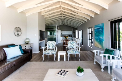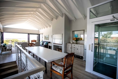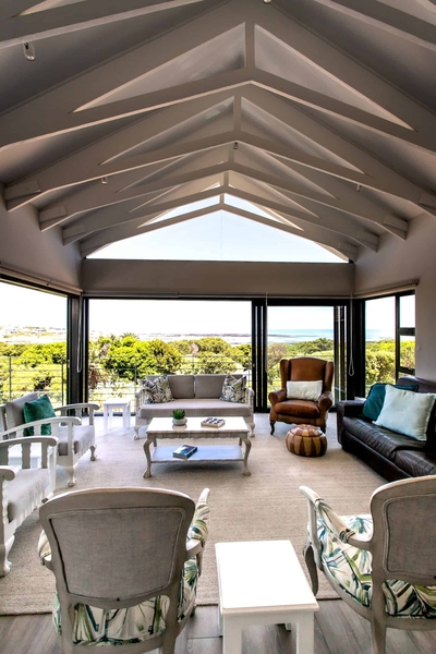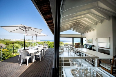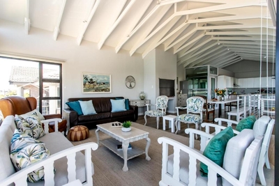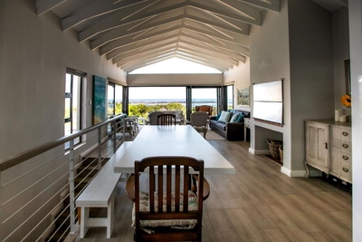Eingebettet in den charmanten Vorort Onrus in Hermanus bietet dieses Ferienhaus mit 4 Schlafzimmern einen atemberaubenden Blick auf das Meer.