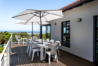 Die offenen Wohn-, Ess- und Küchenbereiche strahlen zeitgenössische Eleganz aus und sind nahtlos mit einer geräumigen Holzterrasse verbunden. Diese Oase im Freien ist perfekt für Mahlzeiten im Freien und bietet eine atemberaubende Kulisse des Ozeans.