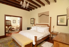 Die vier Suiten im Herrenhaus sind außergewöhnlich geräumig und blicken auf den Pool und den seitlichen Rosengarten, während die vier Suiten in den Kutschenhäusern zwei Zwillingssuiten auf der oberen Ebene und zwei Gartensuiten mit Eingängen zum inneren Rosenhof bieten.