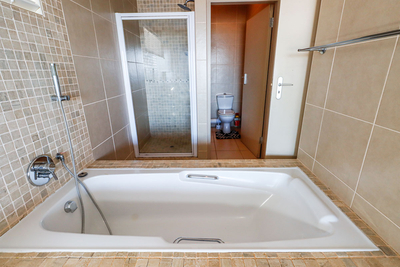 Das Hauptschlafzimmer ist mit einem Doppelbett und einem eigenen Badezimmer mit Badewanne und Dusche ausgestattet. Das zweite Schlafzimmer bietet ebenfalls ein Doppelbett, während das dritte mit zwei Einzelbetten ausgestattet ist. Diese beiden Schlafzimmer teilen sich ein zweites Badezimmer, das ebenfalls mit Badewanne und Dusche ausgestattet ist. Hochwertige Bettwäsche und Handtücher werden gestellt. Strandtücher sollten jedoch selbst mitgebracht werden.